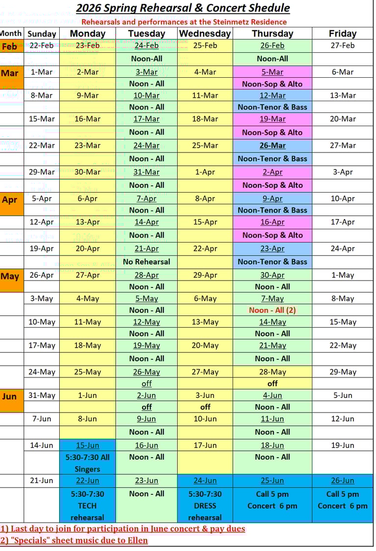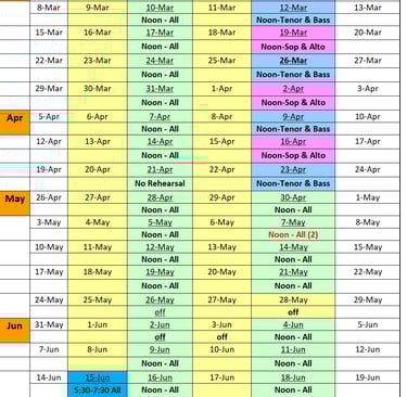 Rehearsal Days and Time: Every Tuesdays & Thursdays from Noon to 1:00p.m. See "Events/Calendar" below