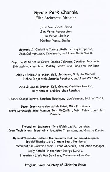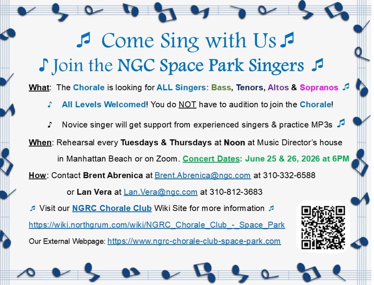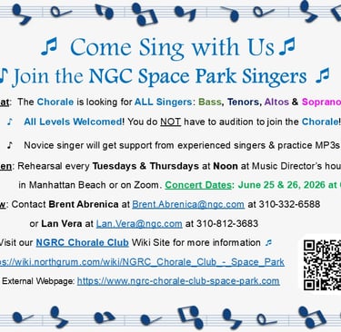 The Space Park Singers are a four-section chorale – Soprano, Alto, Tenor, and Bass (SATB) for NGC employees, retirees, family & friends. Chorale Club was started in 1968 at TRW with the first ever Spring concert titled "I Hear America Singing" followed by a Winter concert "Christmas Carols". We come from all kinds of musical backgrounds; a novice singer will get support from more experienced singers. You do NOT have to audition in order to join the Chorale.